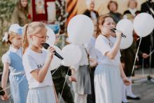 Учащиеся воскресной школы Никольского храма исполнили песню "Мир без войны" на русском, украинском и английском языках.
