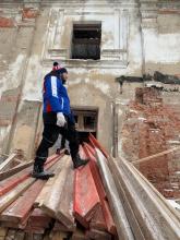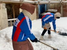 Участники отряда "Порох" приняли участие в уборке снега и складированию досок, переданных в дар приходу и предназначенных для реставрации Никольского храма.
