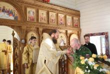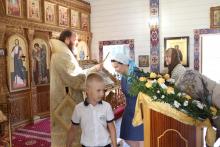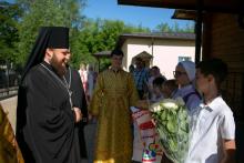 У входа в храм Владыку Аксия встретили учащиеся воскресной школы. Дети прочитали стихи и поздравили Владыку с престольным праздником.