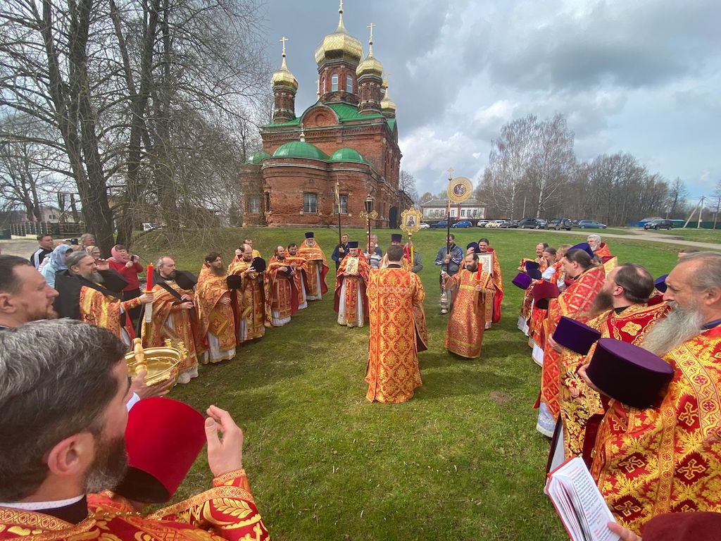 По заамвонной молитве был совершен праздничный пасхальный Крестный ход с окроплением святой водой. После Крестного хода благочинный Чеховского церковного округа иерей Константин Александров обратился к собравшимся, поздравив собравшихся с праздником Святой Пасхи и сердечно поблагодарил всех за оказанную посильную помощь в деле восстановления порушенной святыни.