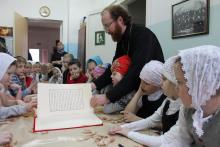 Готовясь ко встрече, сами ребята подготовили рассказ об истории праздника и выучили стихи о главных книгах каждого христианина – Евангелии, Псалтири, житиях святых, молитвослове. А настоятель храма отец Роман принёс для своих гостей уникальные книжные издания, хранящиеся в его личной библиотеке: факсимильное издание азбуки Кариона Истомина (напечатана в 1694 году), книгу Нового Завета 1815 года издания в подлинном кожаном переплёте, акафист Воскресению Христову, изданный в 1879 году, и ряд других раритетов. Ребята подержали в руках эти книги, попробовали читать старинные тексты.