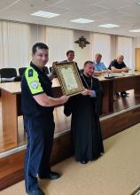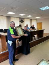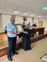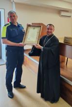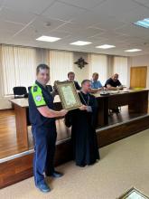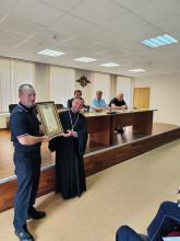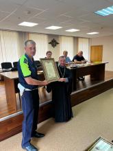 По приглашению командира отдельного специализированного батальона дорожно-патрульной службы ГИБДД ГУ МВД России по Московской области полковника П.А.Фирманюка ответственный Епархиального отдела по взаимодействию с Вооружёнными силами и правоохранительными органами в Чеховском благочинии, настоятель Никольского храма деревни Кулаково г.о. Чехов иеромонах Феодосий (Поддубоцкий) обратился к собравшимися сотрудникам ДПС со словами поздравления и вручил Архиерейские грамоты архиепископа Подольского и Люберецкого Аксия отличившимся полицейским.