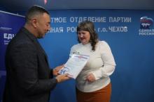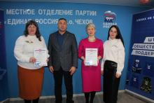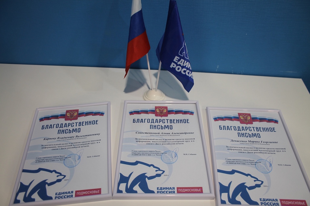 13 января в общественной приёмной партии «Единая Россия» в Чехове активистам Чеховского клуба православных журналистов «Стриж» при газете Чеховского благочиния «Добрый пастырь» были вручены благодарности главы муниципального округа Чехов М.Н.Собакина. Благодарности за значительный вклад в развитие средств массовой информации, многолетний плодотворный труд и в связи с Днём российской печати получили старший библиотекарь Центральной городской библиотеки города Чехова М.Г.Денисенко, редактор новостного портала «Чехов Вид» В.В.Карпов и регент Христорождественского храма села Мелихово м.о. Чехов Я.А.Совостенкова. Награды журналистам вручил депутат Совета депутатов м.о. Чехов К.К.Безрукавый.