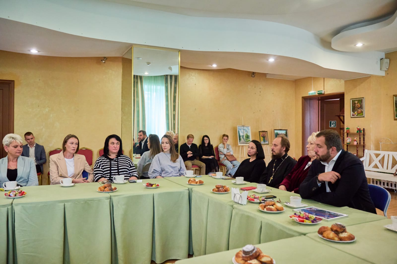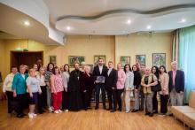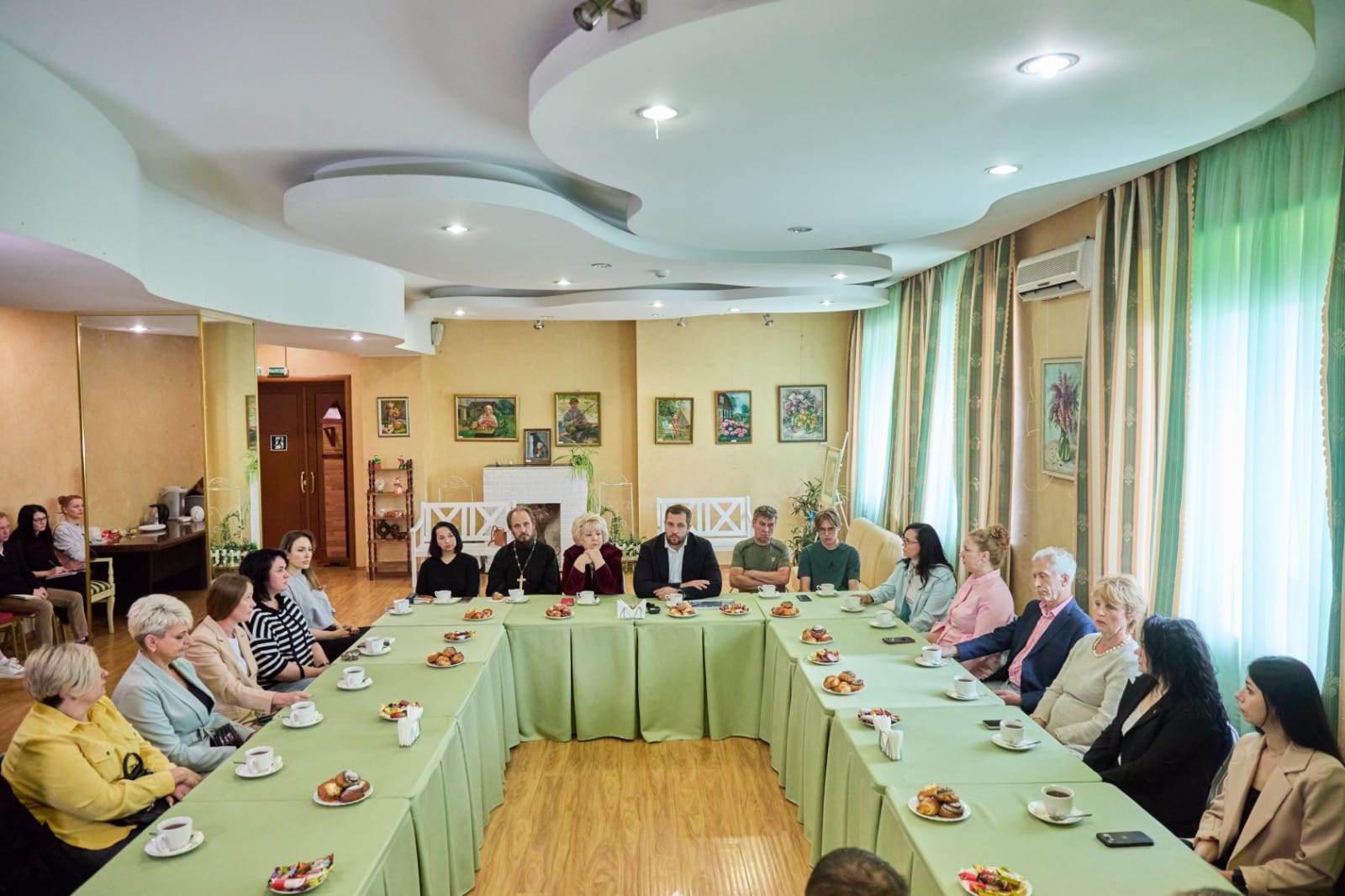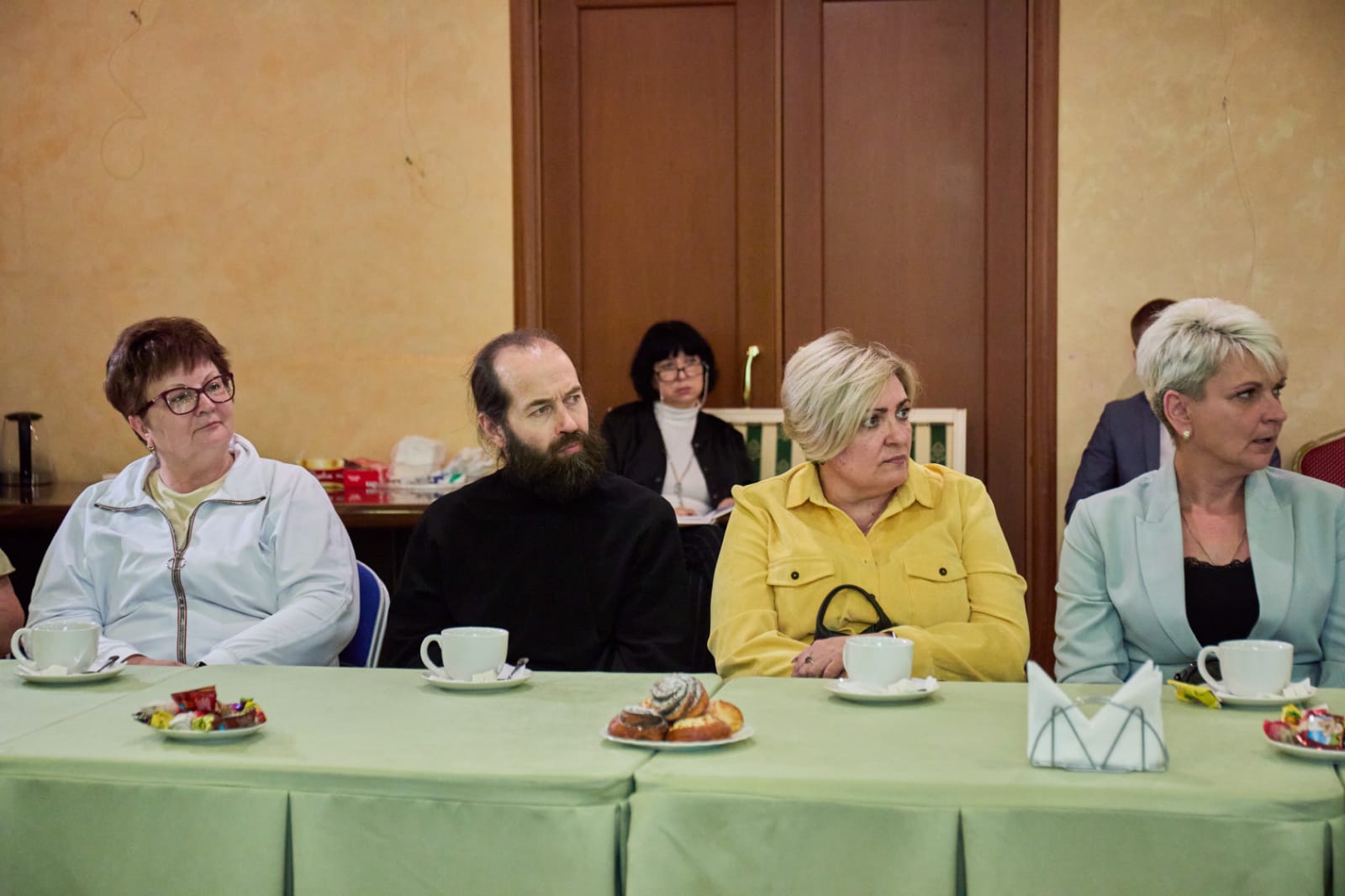 Среди участников встречи были ответственный Епархиального отдела по благотворительности и социальному служению в Чеховском благочинии, настоятель Михаило-Архангельского храма деревни Хлевино м.о. Чехов иерей Михаил Тарасов, его помощница А.Н.Миролаева, клирик Богородицерождественского храма посёлка Васькино м.о. Чехов диакон Андрей Климушкин и координатор мастерской по изготовлению окопных свечей в Вознесенской Давидовой пустыни Т.А.Миронова.