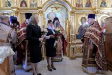 По завершении литургии и крестного хода игумен Сергий поздравил настоятеля храма протоиерея Георгия Захарова с 60-летием и преподнёс ему наперсный крест с украшениями. Далее отца Георгия поздравили начальник Управления развитием отраслей социальной сферы О.Н.Щукина и начальник Управления образования м.о. Чехов И.А.Заболотнева.