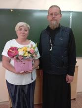 8 сентября среднюю школу №3 города Чехова посетил заместитель благочинного Чеховского церковного округа, настоятель храма святителя Луки Симферопольского города Чехова иерей Дионисий Пугачёв. Он поздравил классного руководителя 2 «А» класса Н.В.Гущину с днём Ангела и рассказал ребятам о праздновании дня небесного покровителя, о значении молитвы и обращения к Богу, поговорил с детьми о вреде сквернословия и важности послушания старшим наставникам.