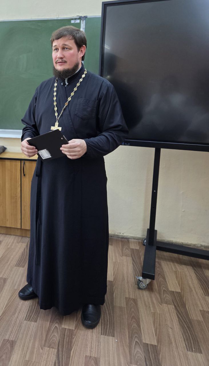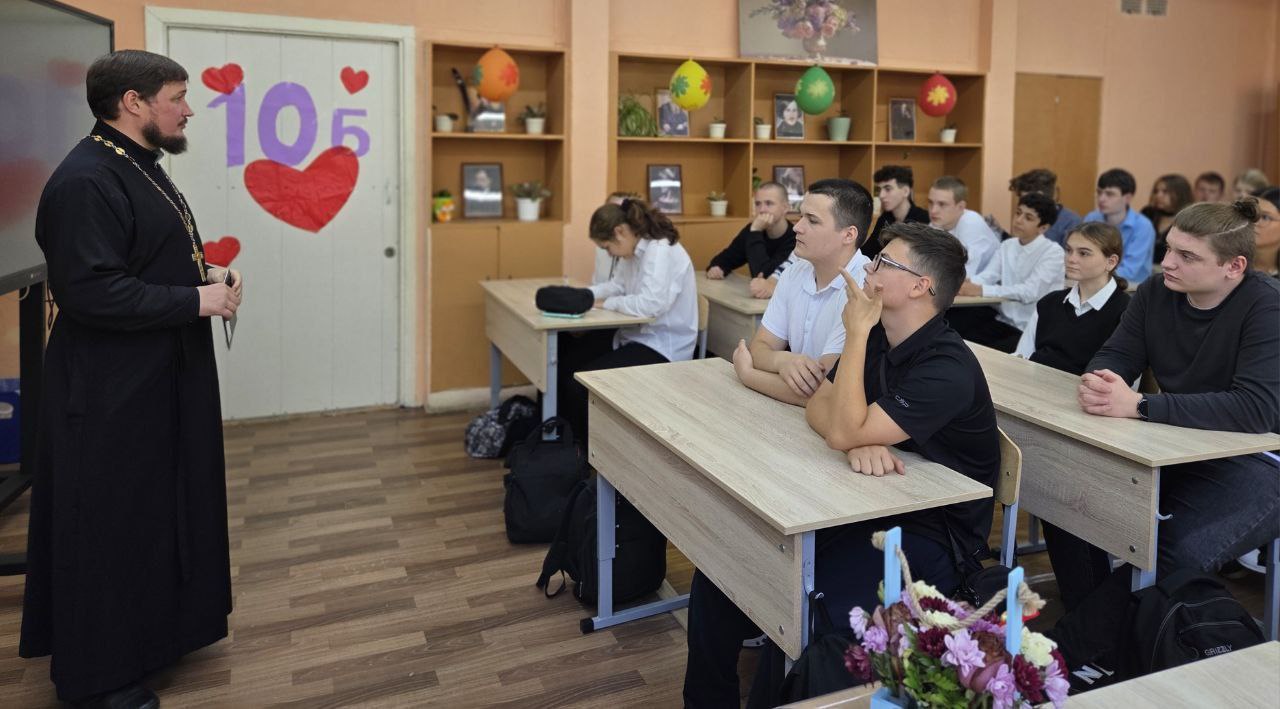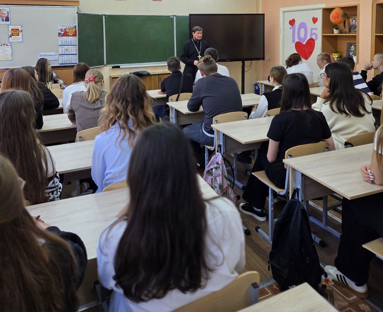 12 сентября в рамках просветительского проекта Подольской епархии «Диалог со священником» настоятель Преображенского храма деревни Спас-Темня м.о. Чехов иерей Николай Метенько провёл первую встречу в этом учебном году с учащимися 10 класса средней школы №1 города Чехова.