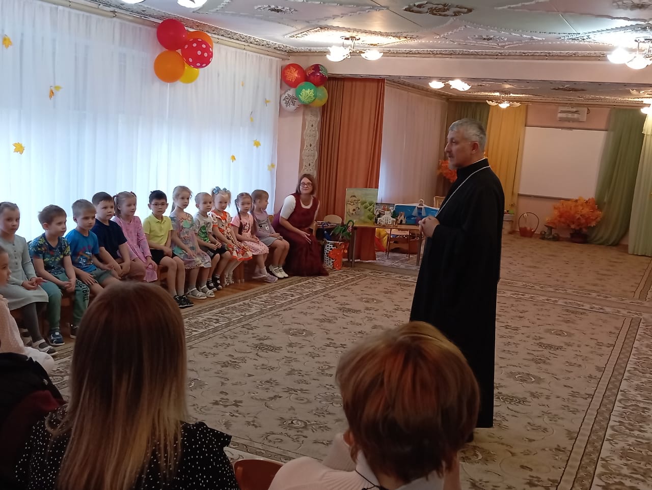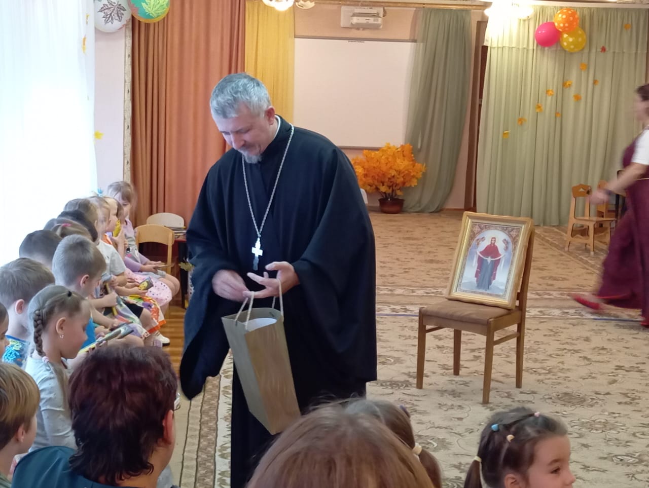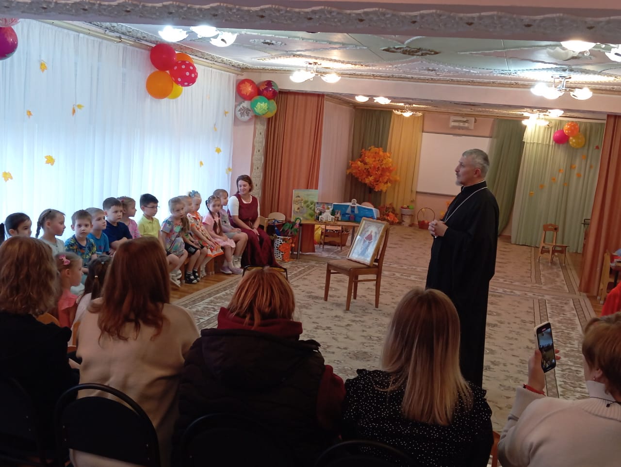 14 октября в детском саду №4 города Чехова прошёл праздник, посвящённый Покрову Пресвятой Богородицы. На мероприятие был приглашён настоятель Христорождественского храма села Мелихово м.о. Чехов иерей Георгий Шадрин. Воспитанники старшей группы участвовали в творческих номерах и подвижных играх. Отец Георгий рассказал детям об истории праздника и его значении для верующего человека и вручил всем сладкие подарки.
