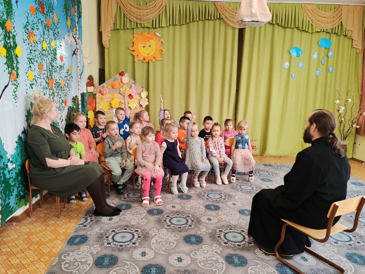 20 ноября в рамках просветительского проекта Подольской епархии «Добрый сад» в дошкольном отделении школы №8 города Чехова прошла встреча клирика храма Рождества Пресвятой Богородицы села Васькино м.о. Чехов диакона Андрея Климушкина с воспитанниками и педагогами учреждения. Отец Андрей побеседовал с детьми и их воспитателями о любви и уважении друг к другу в семье, а также напомнил о важности воспитания доброты, заботливости и терпения в детях.
