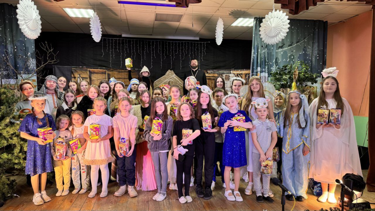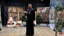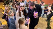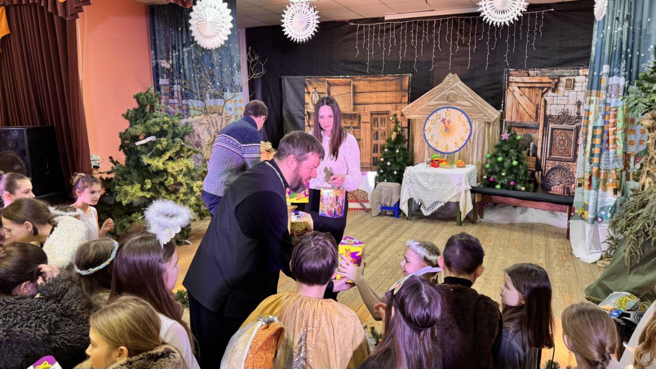 По окончании представления ответственный Епархиальной комиссии по вопросам семьи, защиты материнства и детства в Чеховском благочинии, настоятель Никольского храма посёлка Крюково м.о. Чехов иерей Владимир Тимченко поздравил детей и их родителей с праздником Рождества Христова и вручил ребятам сладкие подарки.