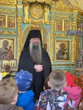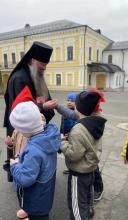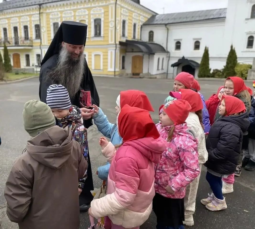 Гостей встретил благочинный Чеховского церковного округа и монастырей Подольской епархии, настоятель обители игумен Сергий (Куксов). Вместе с отцом Сергием дети посетили Знаменский храм, где находятся святые мощи основателя монастыря — преподобного Давида Серпуховского. В храме все вместе пропели тропарь Пасхи, затем отец игумен похристосовался с ребятами.