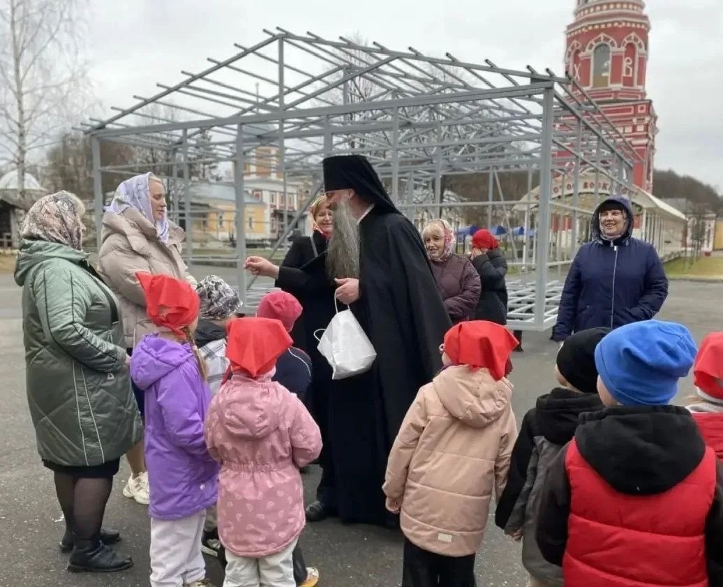 По традиции игумен Сергий вручил каждому ребёнку пасхальный сувенир — шоколадное яйцо. Такие же гостинцы получили воспитатели.