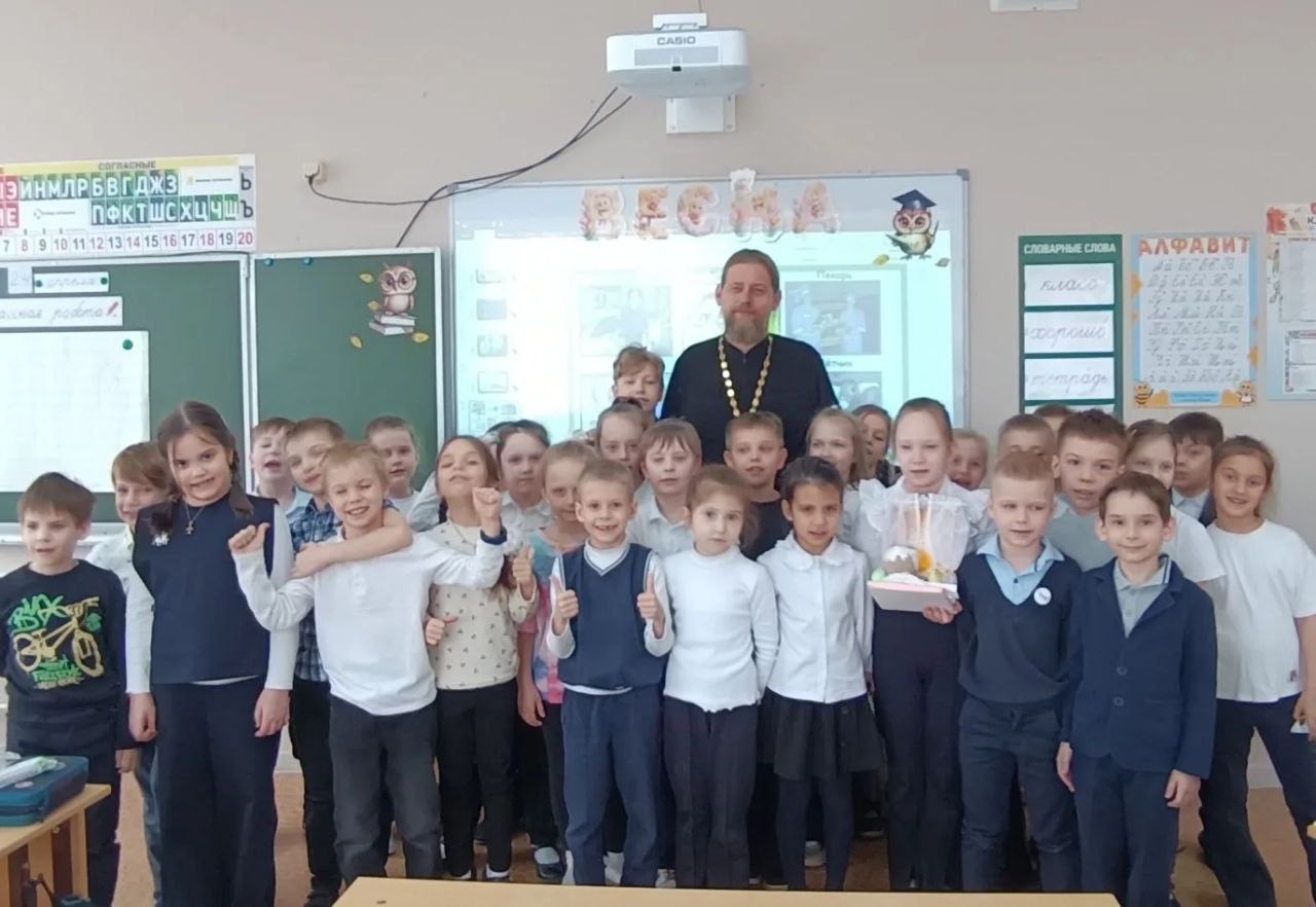 Отец Дионисий побеседовал с первоклассниками о Воскресении Христовом и заповедях Божиих, а также прочитал детям пасхальную сказку «И звери».