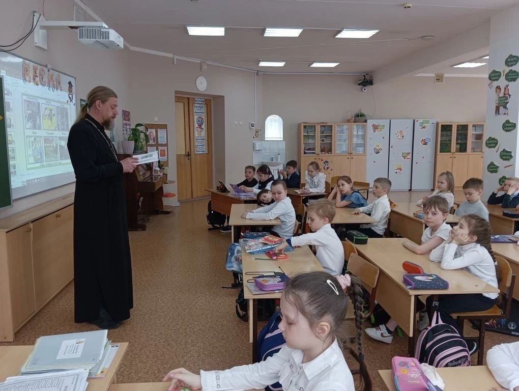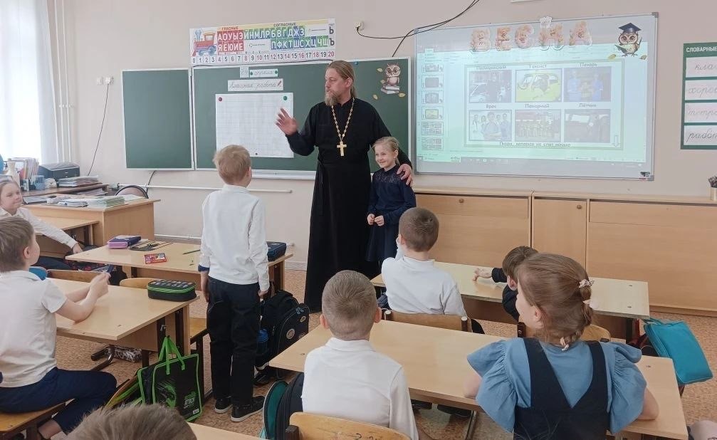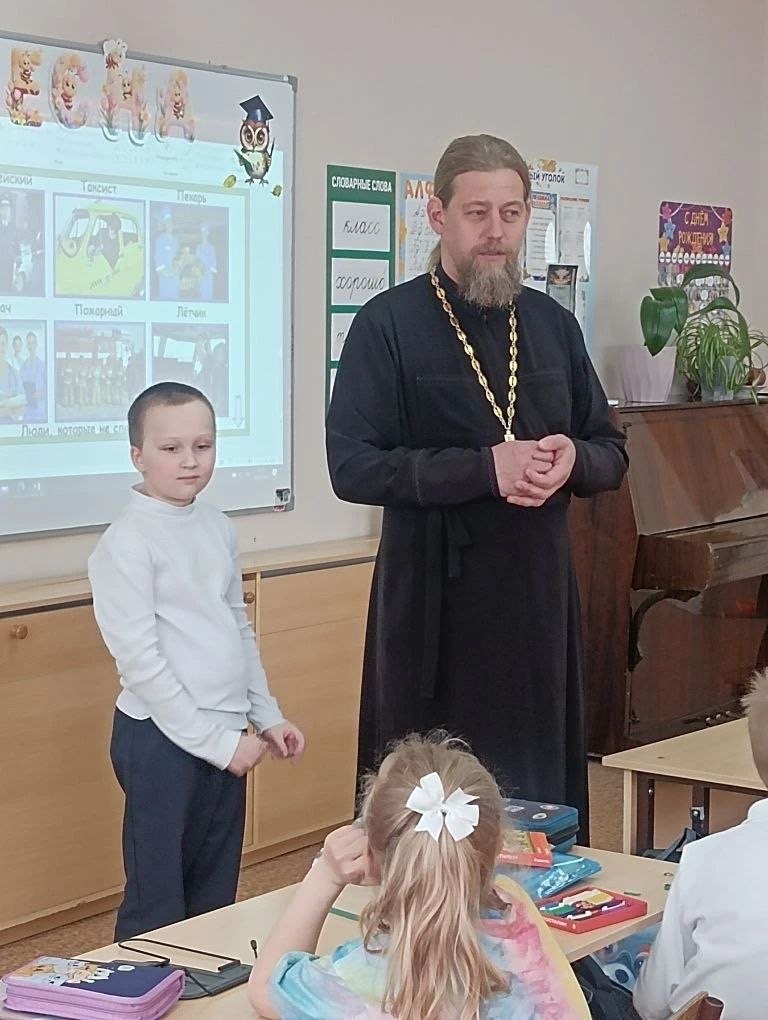 24 апреля школу №3 города Чехова посетил заместитель благочинного Чеховского церковного округа, настоятель храма святителя Луки Симферопольского города Чехова иерей Дионисий Пугачёв. Встреча состоялась по приглашению классного руководителя 1 «А» класса Н.И.Деливрон.