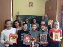 В этот раз батюшка рассказал детям об истории письменности, о первых книгах, о важности того дела, которое было осуществлено на Руси ее первопечатниками — Иоанном Федоровым и Петром Мстиславцем, о том, какое отношение оно имеет к сегодняшнему дню, к нам самим. Учащиеся также познакомились с различными богослужебными книгами и поразмышляли о других способах передачи информации, в частности, о графическом, в связи с чем дети очень внимательно рассмотрели храмовые изображения и попытались понять и проанализировать, какой внутренний посыл у того или иного библейского сюжета.