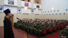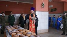 Священнослужитель обратился с поздравлением к личному составу части, солдатам и сотрудникам столовой, где освятил пасхальную снедь.