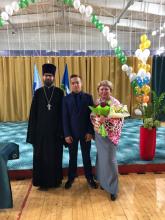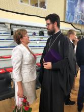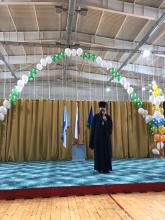 Священник Алексий в приветственном слове поздравил директора Подорожную Татьяну Геннадьевну, преподавателей, воспитателей, тренеров и учащихся с новым учебным годом и новым спортивным сезоном.