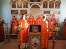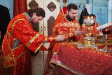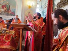 По окончании Литургии было совершено славление святому и вознесена сугубая молитва об имениннике, настоятеле Владимирского храма протоиерее Владиславе.
