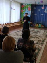 30 марта настоятель Покровского храма п. Мещерское г.о. Чехов иерей Роман Толстых посетил местный детский сад. На встрече присутствовали заместитель директора детского сада Е.В. Мных, педагоги воспитательного учреждения, родители детей, и сами дети.