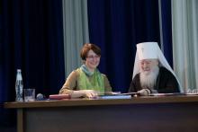 Владыка Ювеналий обратился к собравшимся с докладом и вручил патриаршие юбилейные медали, посвященные 100-летию восстановления Патриаршества в Русской Православной Церкви министру образования Московской области М.Б. Захаровой.
