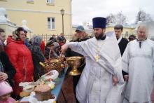 По завершении богослужения около Зачатьевского храма города Чехов священник Константин освятил куличи.